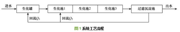 完全混合式曝氣系統(中試規模)在無錫某城鎮污水處理廠運行,系統為鋼板池體,長約為10 m、寬為1.5 m、高為3.5 m,設計處理能力為100 t·d-1,工藝流程如圖 1所示.原水通過進水泵進入生化罐,然后依次流經生化池1、生化池2和生化池3,生化罐及各生化池底部均布置穿孔管曝氣,最后進入過濾沉淀池進行泥水分離(利用沉淀池中部微孔過濾器進行泥水分離,微孔濾料孔徑為0.45 μm,對反應器內污泥進行截留),處理后出水外排.系統包括兩套回流系統,分別維持生化罐和生化池內的污泥濃度.系統自2011年啟動運行,效果穩定,2015年春節前停止運行,春節后再次啟動,運行參數如下:進水流量為3 m3·h-1,HRT為10~12 h,SRT大于30 d,反應器內污泥濃度為7~10 g·L-1,回流比Q1為150~200%,Q2為200%,DO設定為1~3 mg·L-1,濾料反沖洗頻率為8 h.污泥來源于污水處理廠好氧池.