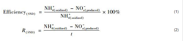 式中,Efficiency(SND)為同步硝化反硝化率(%);R(SND)為同步硝化反硝化速率mg·(L·h)-1;NH4(oxidized)+為NH4+-N的消耗量(mg·L-1);NOx(produced)-為NO3--N和NO2--N的生成量(mg·L-1);t為運行時間(h).