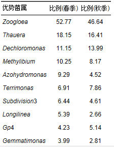 為準確反映完全混合式曝氣系統內的微生物群落結構,對系統穩定運行的不同時期(春季和秋季)的微生物群落結構進行解析.通過高通量測序發現,系統污泥中微生物共有42個綱,污泥微生物比例分布如圖 8所示(選取比例超過1%的綱繪入圖中).不同時期系統污泥微生物菌群結構基本一致,以變形菌綱為主,其中β變形菌綱、γ變形菌綱、δ變形菌綱和α變形菌綱比例分別占變形菌綱54.45%、10.60%、7.80%和7.85%;鞘脂桿菌綱占6.02%,厭氧繩菌綱占2.71%,放線菌綱占1.66%,酸桿菌綱占1.03%.其中β變形菌綱與污水處理過程密切相關,是污水處理廠脫氮的重要菌群,可以在低溶解氧條件下利用有機物生長繁殖.測序結果表明(表 3),系統污泥微生物中動膠菌屬(Zoogloea),陶厄氏菌屬(Thauera)和Dechloromonas菌屬始終處于優勢地位,其中Zoogloea屬與菌膠團的形成有密切關系,可能會促進系統實現同步硝化反硝化作用;Thauera屬是β變形菌中的一類革蘭氏陰性細菌,大部分為桿狀且以反硝化菌居多,如T. aromatica、T.mechernichensis和T. terpenica等,而其中T. mechernichensis是一類典型的好氧反硝化菌;Dechloromonas菌屬具有良好的反硝化功能,主要功能菌D. agitate和D. denitrificans都具有較強的硝酸鹽還原能力[23].隨著季節的變化,僅Azohydromonas和Longilinea菌屬存在較大波動,但污泥微生物群落結構整體變化較小,使完全混合式曝氣系統始終保持良好的脫氮效能.完全混合式曝氣系統內污泥微生物多樣性豐富,為系統的高效脫氮奠定了基礎.具體參見污水寶商城資料或http://www.bnynw.com更多相關技術文檔。