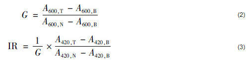 式中, G為生長因子,IR為誘導(dǎo)率;G>0.5時可用于計算IR;IR≥1.5可判斷致突變陽性;A600, T、A600, B、A600, N、A420, T、A420, B、A420, N分別為測定樣品、空白對照和溶劑對照在600 nm、420 nm處的光密度值.