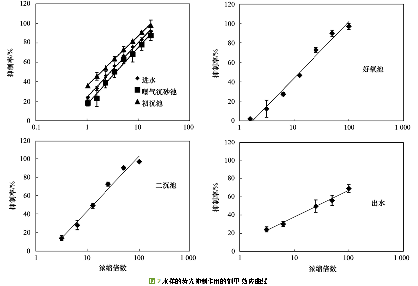 本實驗中陽性對照E2的EC50為15.05 ng·L-1,與Beck等[26]研究相比(EC50=48.96 ng·L-1),該方法的靈敏度較高,適用于廣范圍的水樣類型.水樣的β-半乳糖苷酶活性的劑量-效應(yīng)關(guān)系如圖 4所示.水樣的雌激素活性用濃縮倍數(shù)N表示時,進水、曝氣沉砂池、初沉池、好氧池、二沉池以及出水的EC50分別為2.07、2.02、2.45、7.57、8.29、7.89.將上述樣品用EEQE2表示時,其EEQE2分別為7.29、7.45、6.15、1.98、1.82、1.89 ng·L-1.與急性毒性、遺傳毒性類似,曝氣沉砂池的雌激素活性最強.人體的尿液中,雌激素以共軛的形式存在,通過物質(zhì)之間的化學作用或者微生物酶的作用,曝氣沉砂池中的雌激素以自由態(tài)的形式被釋放,這可能導(dǎo)致雌激素活性增加.整體而言,雌激素活性也隨著流程的進行逐漸降低.其中,好氧池對雌激素活性的去除率高達72.84%.這種去除效果可能是由于微生物的降解和污泥的吸附作用.尤其是A2/O工藝具有延長生物處理的特點,在脫氮除磷過程中,氨氧化菌可將雌激素物質(zhì)硝化,進而產(chǎn)生雌激素活性較低的產(chǎn)物,如E1和E2的硝化產(chǎn)物的活性低于母體本身.而加氯消毒沒有降低出水的雌激素活性,這可能是由于在消毒過程中產(chǎn)生的消毒副產(chǎn)物具有雌激素活性, 從而導(dǎo)致出水的雌激素活性比較恒定的現(xiàn)象,例如E1、E2和EE2的消毒副產(chǎn)物具有與母體相當?shù)拇萍に鼗钚?