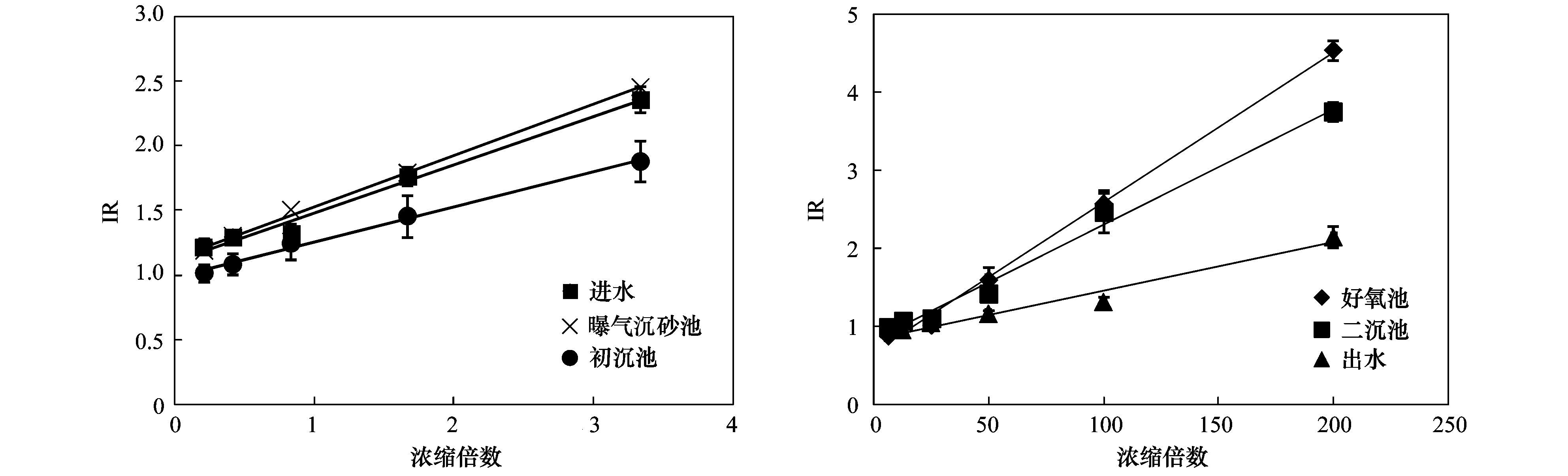 本實驗以4-NOQ為陽性對照,其IR1.5-4-NOQ的值為19.58 μg·L-1.當4-NOQ的濃度為50 μg·L-1,IR的值為3.38,與國際標準ISO13829具有可比性,說明該方法的可行性.水樣的遺傳毒性的劑量-效應(yīng)曲線如圖 3所示,當IR=1.5時,進水、曝氣沉砂池、初沉池、好氧池、二沉池以及出水的濃縮倍數(shù)N分別為1.15、0.92、1.89、43.79、48.64、111.50.將上述樣品的遺傳毒性用TEQ4-NOQ表示,分別為17.02、21.28、10.36、0.447、0.403、0.17 μg·L-1.遺傳毒性的順序依次為:曝氣沉砂池>進水>初沉池>好氧池>二沉池>出水.在本實驗中,曝氣沉砂池的遺傳毒性大于進水,這可能是由于曝氣沉砂池的曝氣和水流的螺旋旋轉(zhuǎn)作用,使污水中懸浮顆粒相互碰撞、摩擦,并受到氣泡上升的沖刷作用,導(dǎo)致砂粒上附著的有機成分被剝離而溶于水中引起.除曝氣沉砂池以外,隨著工藝流程進行遺傳毒性降低.其中,好氧池對遺傳毒性的去除率高達95.68%,因此二級處理工藝能夠顯著地降低遺傳毒性.加氯消毒后,污水出水的遺傳毒性降低57.82%,該結(jié)果和污水對發(fā)光菌的熒光抑制毒性具有一致性.造成加氯消毒后遺傳毒性降低的原因如發(fā)光菌急性毒性所述,投氯量較多時,消毒副產(chǎn)物被分解.