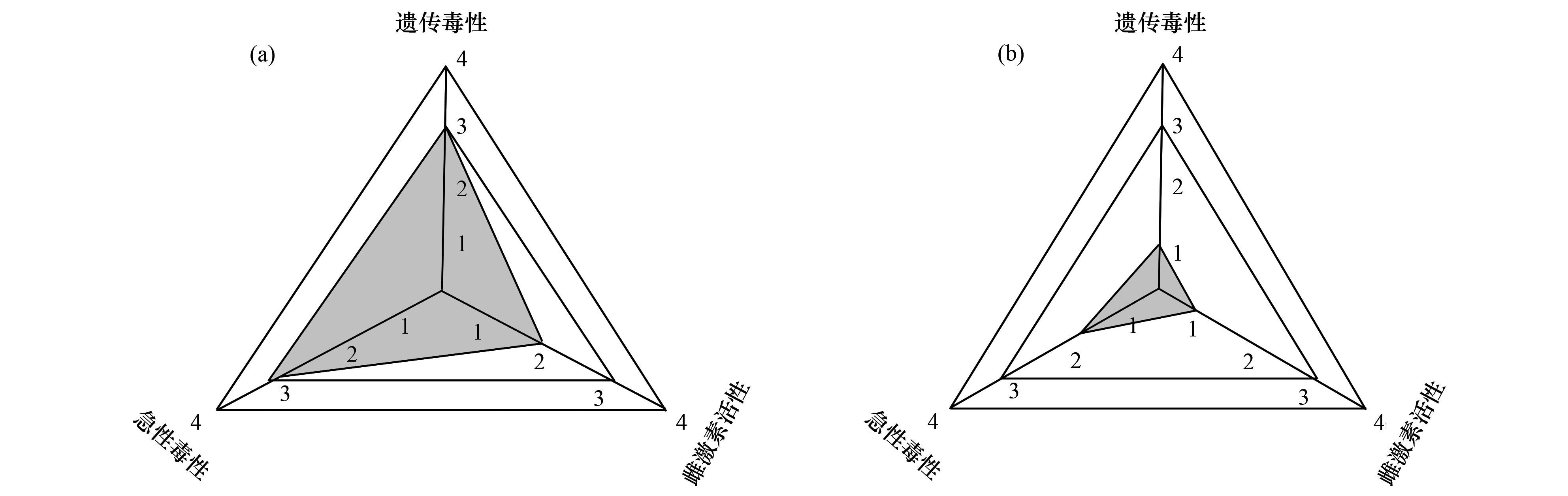 在3種體外生物毒性測試的基礎(chǔ)上,通過SSD法計算得出PNECphenol為2.94 mg·L-1,參照Xu等得出的PNEC4-NOQ(0.64 μg·L-1) 和PNECE2(2 ng·L-1) 值,結(jié)合水質(zhì)風險分級評價方法,對各流程出水進行了水質(zhì)安全評價研究,結(jié)果如圖 5所示.進水的生物毒性得分最高,其中急性毒性和遺傳毒性得分為3,雌激素活性得分為2[圖 5(a)],水質(zhì)安全級別為C級,屬于較差的水質(zhì).經(jīng)曝氣沉砂池和初沉池處理后,污水水質(zhì)安全級別并沒有提高[圖 5(a)].經(jīng)過好氧池處理之后,發(fā)光菌毒性得分為2,遺傳毒性和雌激素活性得分為1,水質(zhì)級別提高到B級[圖 5(b)],經(jīng)二沉池和加氯消毒處理之后,出水水質(zhì)安全性沒有得到進一步改善,水質(zhì)級別仍為B級[圖 5(b)].顯然污水的雌激素活性對水質(zhì)安全性影響最小,而發(fā)光菌急性毒性對其影響最大.由此可知,根據(jù)污染物具有的主要生物毒性效應(yīng)而采取針對性的處理工藝更有利于水質(zhì)達到安全性級別.本實驗中,雖然生物毒性都得到降低,但污水的急性毒性效應(yīng)未使出水水質(zhì)達到安全性級別,可能會對周圍的生態(tài)環(huán)境產(chǎn)生潛在的生態(tài)危害.