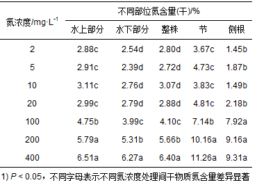 表 3 不同氮濃度污水對粉綠狐尾藻不同部位氮含量的影響1)