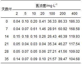 不同氮濃度污水氨氮濃度隨粉綠狐尾藻處理時間增長而逐漸降低(表 6).粉綠狐尾藻處理7d,低氮濃度污水氨氮去除率為92.4%~98.8%、接近100%,高氮濃度污水氨氮去除率只有33.5%~69.2%、平均為52.9%;35 d時,氮濃度100 mg·L-1、200 mg·L-1的污水氨氮去除率分別為99.6%和99.3%、近100%,氮濃度400 mg·L-1的污水氨氮的去除率僅為60.2%.粉綠狐尾藻對不同氮濃度污水氨氮的去除速率隨時間呈下降趨勢(表 7).在0~7 d,粉綠狐尾藻對氨氮的去除速率最高且隨污水氮和氨氮濃度升高而增加;氮濃度100 mg·L-1、200 mg·L-1的污水分別在第2周和第4周后氨氮的去除速率顯著下降,而氮濃度400 mg·L-1的污水在28~35 d仍有相對較高的氨氮去除速率.由此說明,對氮濃度不高于20 mg·L-1的低氮濃度污水,粉綠狐尾藻處理7 d就能夠去除90%以上氨氮且去除速率顯著下降;對氮濃度100 mg·L-1、200 mg·L-1的污水,粉綠狐尾藻分別處理2和4周能夠去除氨氮90%以上且去除速率顯著下降;但對氮濃度400 mg·L-1的污水,處理5周只能去除60%的氨氮.