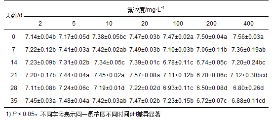 污水pH隨氮濃度和粉綠狐尾藻處理時間而有所變化(表 12). 2~20 mg·L-1的低氮濃度污水pH隨水體氮濃度升高和粉綠狐尾藻處理時間增加整體呈上升趨勢,但均在7.1~7.6之間,呈微堿性,這與水體氨氮被大量去除有關;100~400 mg·L-1的高氮濃度污水pH隨粉綠狐尾藻處理時間增加呈下降趨勢,但pH值均在6.5~7.6之間,可能是因為粉綠狐尾藻生長過程中向水體中釋放了某些酸性物質.因此,試驗期間所有處理水體pH < 7.6,未達到氨揮發的條件之一的pH>8.0,氨揮發可忽略.