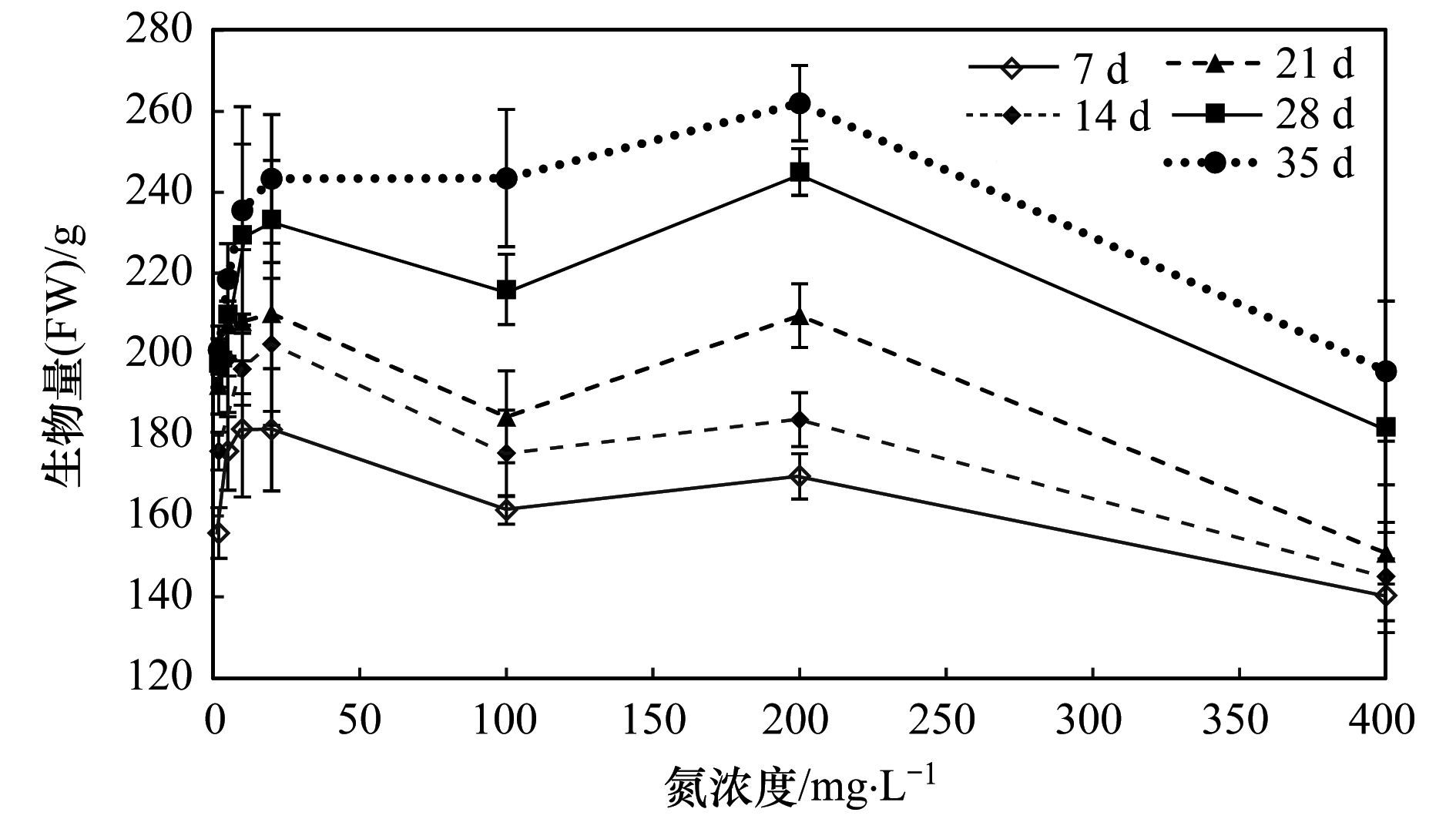 本研究表明,粉綠狐尾藻的生物量在處理21 d內隨污水氮濃度升高到20 mg·L-1達到最大,而100~400 mg·L-1氮濃度則有所下降,21~35 d隨污水氮濃度升高到200 mg·L-1達到最大而400 mg·L-1氮濃度依然有所下降;粉綠狐尾藻生物量的增長率,在14 d內以低氮濃度污水即氮濃度2~20 mg·L-1較高,14~21 d處理間沒有明顯規律,21~35 d以氮濃度100~400 mg·L-1的高氮濃度污水較高且約為低氮濃度污水的1.5~2倍,其中以200 mg·L-1最高.這與朱丹婷等[23]和葛芳杰等的研究結果類似,朱丹婷等利用黑藻處理氮濃度為2、4、8 mg·L-1的富營養化水體,黑藻生物量隨氮濃度的升高而增加且以氮濃度8 mg·L-1處理生物量的增長最快;葛芳杰等用穗花狐尾藻處理0.875、7.0、56.0 mg·L-1氮濃度的水體,穗花狐尾藻生物量以7.0 mg·L-1水體增長最快而以56.0 mg·L-1增長最慢.綜上所述,在3周內,粉綠狐尾藻以氮濃度不高于20 mg·L-1的低氮濃度污水生長較好;4~5周,則以氮濃度200 mg·L-1的高氮濃度污水生長較好;氮濃度400 mg·L-1抑制粉綠狐尾藻生長.說明初始階段高氮濃度會對粉綠狐尾藻的生長產生一定的抑制作用,隨后氮濃度降低抑制作用減弱,生物量增長加快;低氮濃度的污水為了滿足粉綠狐尾藻的生長需求,底泥可能向水體釋放氮但又不至于濃度過高抑制生長,后期底泥氮的釋放可能受到限制導致粉綠狐尾藻生長減緩,需要進行進一步研究.
