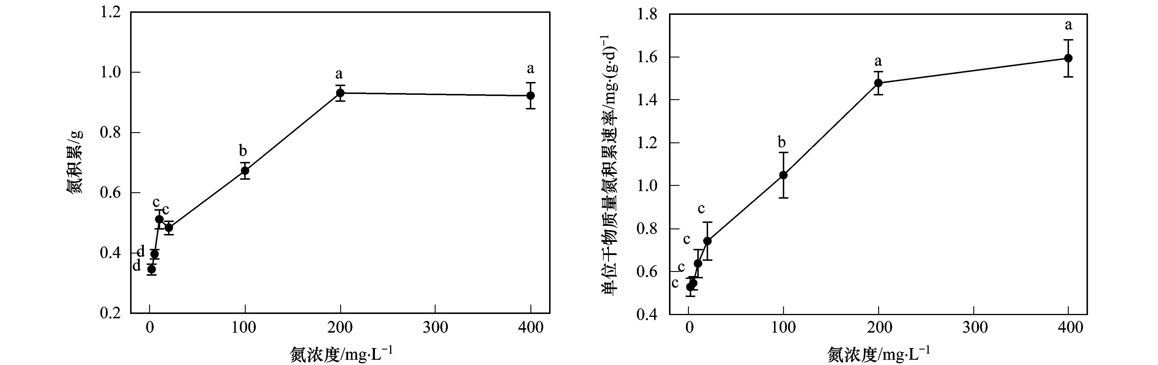 粉綠狐尾藻氮積累量和單位干物質量氮積累速率隨污水氮濃度的升高而增加(圖 2),但低氮濃度處理間基本無顯著差異,氮積累量為0.34~0.51 g,氮積累速率為0.53~0.68 mg·(g·d)-1;高氮濃度氮積累量為0.67~0.93 g,積累速率為0.96~1.59 mg·(g·d)-1;高氮濃度處理粉綠狐尾藻氮積累量和單位干物質氮積累速率顯著高于低氮濃度處理;粉綠狐尾藻氮積累量和單位干物質氮積累速率隨氮濃度升高而增加,至100 mg·L-1、200 mg·L-1均達到顯著水平,但200 mg·L-1和400 mg·L-1間無顯著差異.污水氮濃度由20 mg·L-1到100 mg·L-1、200 mg·L-1時,粉綠狐尾藻氮積累量和單位干物質量氮積累速率呈梯度增加,預示著氮吸收轉化能力顯著提升,氮轉化機制發生突變.