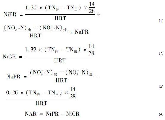計算公式(1)為AOB活性產生NO2-的能力(nitrite production rate,NiPR),計算公式(2)為AnAOB活性消耗NO2-的能力(nitrite consumption rate,NiCR),計算公式(3)為NOB活性產生NO3-的能力(nitrate production rate,NaPR),計算公式(4)為AOB與AnAOB活性平衡指標的積累速率(nitrite accumulation rate,NAR),公式(5)為總氮去除率(nitrogen removal rate,NRR),進出水總氮為NH4+-N、 NO2--N、 NO3--N的總和,假設損失的總氮都通過ANAMMOX過程產生N2的形式排出.