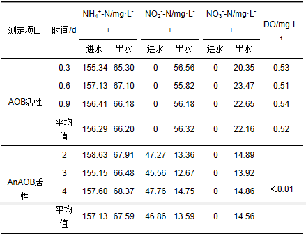 在第一階段,首先接種本課題組培養好的成熟絮體亞硝化污泥20 mL,通入壓縮空氣,維持DO為0.52mg·L-1左右,進出水pH分別為8.08~8.20、 8.00~8.10,在HRT為2 h的情況下穩定運行1 d,其進出水氮濃度見表 2.AOB氧化NH4+產生NO2-的能力NiPR為1.01 kg·(m3·d)-1.