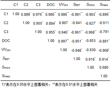 表 4 DOC、UV254、熒光組分的Fmax與活性炭表面孔結構的相關系數矩陣