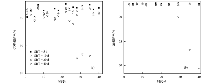 (1) SRT為5~10 d時系統對油脂廢水COD和油的去除率較高;長SRT會使COD處理效果下降,但短期對油的去除率影響不大.