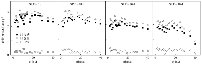 不同SRT條件下酵母系統中LBEPS的組成和含量的變化如圖 2所示,可以看出,對于酵母菌來說,LBEPS的主要成分是多糖,蛋白質含量很少,且EPS總量隨SRT的增大而減少.根據勞倫斯-麥卡蒂方程及其衍生關系式1/θC=Y×Nrs-Kd可知SRT與負荷呈負相關. Batstone等、李久義等認為EPS與污泥負荷呈正比 (即與SRT呈反比),所以在低SRT情況下F/M較高,微生物細胞不能將所有碳源用于細胞合成,多余的含碳基質可以轉化成胞內存儲粒子和在EPS中積累的胞外高分子.從圖 2可看出,對SRT為5 d、10 d的系統,在開始的4~5 d內,LBEPS呈遞增的趨勢,這可能是由于酵母系統對新環境的一種適應過程,為了適應較短的SRT,酵母細胞新陳代謝比較旺盛,所以將油脂廢水中脂肪酸轉化為多糖的量也增多,導致多糖積累,待系統穩定后,LBEPS也基本穩定.對于SRT為40 d的系統,從30 d后有大幅度的降低,這是由于隨著運行的持續,酵母產乳化劑能力相對于酵母增長能力減弱,表現為油脂降解能力下降[見圖 1(b)],同時酵母細胞的菌絲化也影響了油脂的代謝,此時酵母細胞為維持自身生理代謝,可能對EPS中的多糖類物質進行降解.