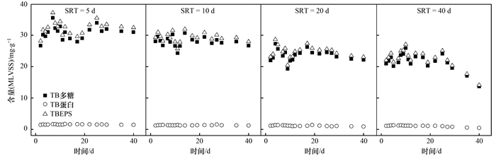 圖 3反映了各系統中TBEPS的變化.可以看出TBEPS仍然以多糖為主,結合圖 2,TBEPS的含量遠遠大于LBEPS,大約是后者10倍左右,這與一些研究的結果一致. TBEPS的組成及含量變化與LBEPS相同,含量隨著SRT的增大而減少.對于SRT為5、10、20 d的系統在最初5 d內TBEPS有所增加,這是酵母對新環境的一種適應,隨后逐漸穩定.對于SRT為40 d的系統,隨著時間的延長,酵母細胞老齡化及代謝產物的積累,酵母細胞有絲化現象,絲化后酵母細胞對油脂類代謝能力減弱,進而轉為利用和代謝TB多糖,導致在20 d后TBEPS逐漸減少.