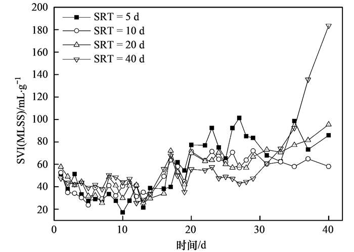 (3) SRT在5~40 d區間內,SRT對酵母污泥的SVI影響差異不顯著;但長SRT有導致系統發生絲狀菌性膨脹的風險.
