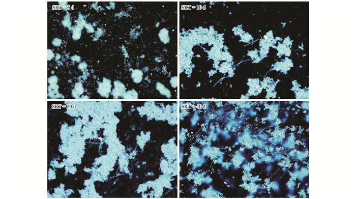 對不同SRT下4個系統的SVI進行了連續監測,結果如圖 4所示.從中可以看出, 在前20 d運行中SVI基本穩定,SVI值隨SRT的延長而增大,說明增大SRT會引起SVI值升高,與陶麗佳等的研究結論相同.但從18 d后,直至30 d間污泥的SVI值隨SRT延長反而減小,可見其規律有別于普通活性污泥,這可能與酵母細胞菌絲化有關.在這個階段,各SRT系統中酵母細胞均有不同程度絲化現象,由絲化導致了污泥質量濃度 (MLSS) 減小,所以總體SVI較運行前期要大;此時,各系統酵母污泥的SV30差異減小,而SRT越長對應系統中的MLSS越大,因而出現了SVI值隨SRT的增長而降低的現象.運行至30 d后,對SRT為40 d的系統,SVI值呈直線上升,一方面是由于較長的SRT條件下,EPS的濃度相對較低 (見圖 2和圖 3),不利于酵母細胞絮凝;另一方面酵母細胞由酵母型向菌絲態轉化導致污泥呈蓬松狀態,難以沉降,周期性排泥導致更低的MLSS. SRT為20 d的系統中SVI的變化與前者相似,但變化幅度稍微緩慢,推測與細胞不同的絲化程度有關.圖 5為不同SRT下各系統在運行后期的顯微鏡圖片.比較可以看出,在SRT為5 d時系統中酵母絮體中菌絲很少;SRT為10、20、40 d時菌絲化程度遞增,在SRT為40 d時可以觀察到明顯的細胞絲化現象.通過Matlab對SRT和SVI因素進行差異性分析,得α=0.45,可以認為不同SRT條件下測得的SVI不具有顯著性差異,說明在當前區間內SRT對酵母處理油脂廢水SVI的影響不顯著.因此,不同SRT對酵母系統的影響,可能更多地體現在SRT對酵母細胞菌絲化程度的影響,低SRT更有利于細胞絲化的控制.