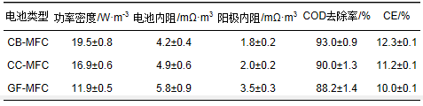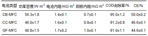 3種MFC的COD去除率和CE如表 2所示.在1 Ω外接電阻下,3組MFC的COD去除率都達到90.0%以上,CE達到40.0%以上.其中CB-MFC的COD去除率和CE最高,分別為 (95.0±1.2)%和 (50.0±0.2)%,其次為CC-MFC,分別為 (91.2±0.8)%和 (46.6±0.1)%,最后為GF-MFC,分別為 (91.0±1.1)%和 (44.6±0.1)%.