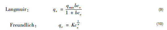 式中,qe為平衡吸附量,mg ·g-1;qmax為最大吸附量,mg ·g-1;ce為平衡濃度,mg ·L-1;b為常數,L ·mg-1;K為Freundlich親和系數,mg ·g-1 ·(g ·L-1)n;n為吸附劑多相性指數.
