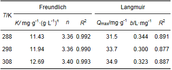 吸附等溫線實驗在3個不同溫度 (288、298、308K) 下進行,實驗結果如圖 4所示.可以看到,隨著溫度的升高,Ti-Zr-D201對磷和氟的吸附效果都有所提高,這表明復合材料對磷、氟的吸附是一個吸熱過程.分別采用Freundlich和Langmuir模型對復合吸附劑吸附磷氟的吸附行為進行非線性擬合,相關表達式如下.