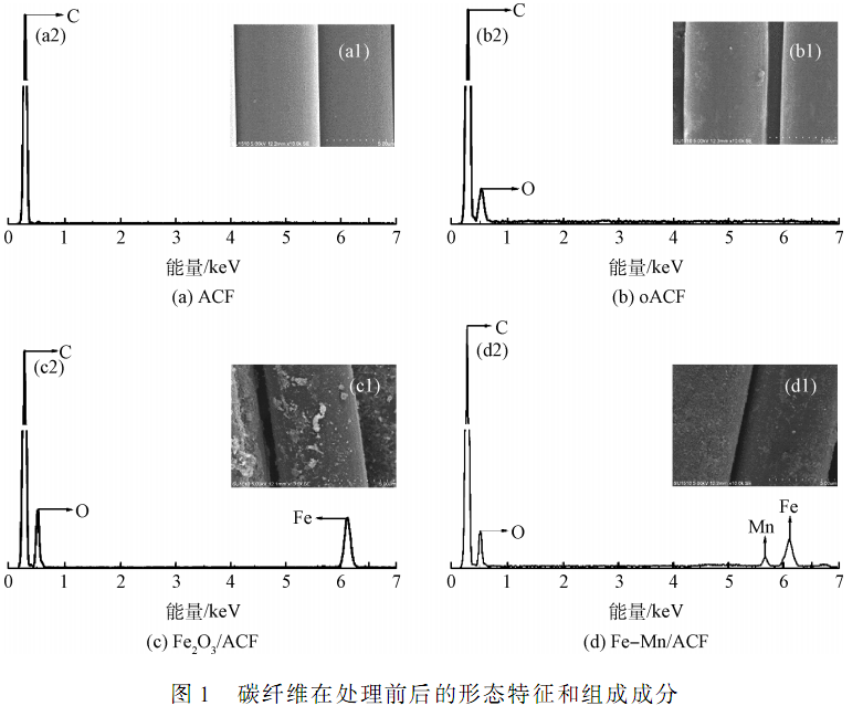 為了觀察樣品的微觀形態(tài)與組成成分,通過(guò)掃描電子顯微鏡( SEM)與能譜分析( EDS)對(duì)其進(jìn)行了觀察測(cè)試,結(jié)果如圖 1 所示。 圖 1( a)是未經(jīng)氧化的碳纖維表面的電鏡圖和能譜分析圖。 可以看出,未氧化的碳纖維表面很平滑,組成成分基本上都是 C 元素。 而經(jīng)過(guò)氧化的碳纖維( oACF)如圖 1( b)所示,硝酸處理之后的碳纖維表面被腐蝕,表面粗糙程度增大,且由圖1( b)中可以看出,經(jīng)過(guò)氧化后除了 C 峰以外還有O 峰,說(shuō)明碳纖維表面成分發(fā)生了變化,在其表面形成了含氧官能團(tuán)。 通常,碳纖維經(jīng)氧化后發(fā)生的變化有助于與復(fù)合材料形成較強(qiáng)的分子間作用力,而且粗糙度的增加可以增大表面接觸面積,以便與復(fù)合材料形成較強(qiáng)的鍵合力。 圖 1( c)和( d)分別為負(fù)載有鐵化合物( Fe2O3 / ACF)和鐵錳化合物的碳纖維( Fe-Mn /ACF) 。 由圖 1( c)中的( c1)和圖 1( d)中的( d1)可以明顯看出,在碳纖維表面負(fù)載有其他物質(zhì),圖 1( c)中的( c2)和圖 1( d)中的( d2)則證明了負(fù)載的物質(zhì)分別為鐵化合物和鐵錳化合物,其中的鐵化合物已被本課題組證實(shí)為 Fe2O3 。 不同的是,圖 1( c)中的( c1)負(fù)載的 Fe2O3 顆粒大小不一,分散不均勻,存在團(tuán)聚現(xiàn)象;而由圖1( d)中的( d1)可知,少量錳化合物的摻入可以抑制 Fe2O3 顆粒粒徑的增長(zhǎng),從而使得碳纖維表面的負(fù)載物顆粒粒徑變小,分散更均勻。 碳纖維表面負(fù)載物顆粒粒徑越小,相對(duì)應(yīng)的比表面積則越大,進(jìn)而可以增加碳纖維表面的活性點(diǎn)位和提高電極的活性。 同時(shí),錳離子的加入也可以和 H2O2 發(fā)生類芬頓反應(yīng)產(chǎn)生·OH。