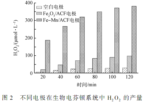 生物電芬頓系統(tǒng)處理污染物的性能與其在陰極·OH 的產(chǎn)量直接相關(guān),而·OH 的產(chǎn)生又與 H2O2和 Fe2 +有關(guān),在該體系中 H2O2 和 Fe2 +分別是通過(guò)在陰極室電子還原 O2 和 Fe3 +得到的;因此,陰極電極性能的提升可以提高污染物的處理效果。 為了研究 Fe-Mn / ACF 電極在生物電芬頓系統(tǒng)中的催化性能,分別檢測(cè)了裝有空白電極、Fe2O3 / ACF 復(fù)合電極和 Fe-Mn / ACF 復(fù)合電極的陰極室的 H2O2 產(chǎn)量,結(jié)果如圖2 所示。 可知,H2O2 的產(chǎn)量在不同電極中的趨勢(shì)相近,在前 60 min 內(nèi),H2O2 的產(chǎn)量在快速增加,但是在 60 min 之后變緩,逐漸趨于穩(wěn)定。 空白電極、Fe2O3 / ACF 復(fù)合電極和 Fe-Mn / ACF 復(fù)合電極在 120 min 后 H2O2 的最大產(chǎn)量分別達(dá)到 30、98 和 381μmol·L - 1。 結(jié)果顯示 Fe-Mn / ACF 復(fù)合電極的 H2O2 產(chǎn)量最大,分別約為空白電極和 Fe2O3 / ACF 復(fù)合電極的 13 倍和 4 倍;因此,在生物電芬頓系統(tǒng)中 Fe-Mn / ACF 復(fù)合電極的性能最好。