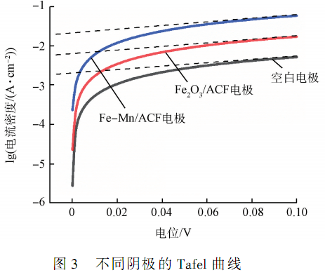 塔菲爾( Tafel)曲線在測(cè)試前需要在更換營(yíng)養(yǎng)液后斷開(kāi)電路 12 h,待系統(tǒng)穩(wěn)定后開(kāi)始測(cè)試。 采用三電極體系,利用電化學(xué)工作站(晨華 CHI660, 中國(guó)) ,分別以空白電極、Fe2O3 / ACF 復(fù)合電極和 Fe-Mn / ACF復(fù)合電極為陰極,Pt 絲電極為對(duì)電極,飽和甘汞電極為參比電極,在磷酸鹽緩沖液中進(jìn)行測(cè)試。 其中,測(cè)試的起始電壓為開(kāi)路電壓,同時(shí)根據(jù) Tafel 曲線可以得出交換電流密度。
