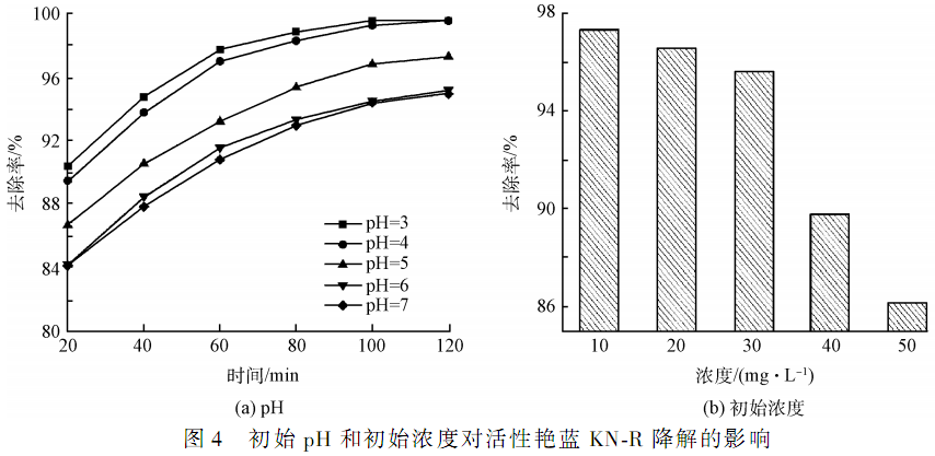 如圖 4( b)所示,在 pH 為 5. 0 的條件下,活性艷藍(lán) KN-R 的去除率隨著初始濃度的增加而降低。 雖然當(dāng)初始質(zhì)量濃度為10 mg·L - 1時(shí)去除率達(dá)到最大,但是與初始濃度為20 mg·L - 1與30 mg·L - 1時(shí)的去除率差距僅為 1%和 2% 。 當(dāng)初始濃度為 40 mg·L - 1和 50 mg·L - 1時(shí)去除率則明顯下降。 原因可能為當(dāng)初始濃度過(guò)大時(shí),降解活性艷藍(lán) KN-R 時(shí)產(chǎn)生的中間產(chǎn)物也隨之增多,會(huì)與活性艷藍(lán) KN-R 競(jìng)爭(zhēng)·OH,使得體系對(duì)·OH 的需求量也增大,最終導(dǎo)致去除率降低。 因此,本研究選取最佳初始濃度為 30 mg·L - 1。
