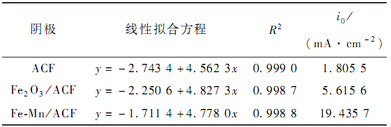 Tafel 曲線可以用來(lái)評(píng)價(jià)樣品的氧化還原反應(yīng)的催化活性,通過(guò) Tafel 曲線圖的線性區(qū)域可以得到交換電流密度( i0 ) ,通常可用其來(lái)作為評(píng)價(jià)電極的電子轉(zhuǎn)移系數(shù)的重要指標(biāo)。 在經(jīng)過(guò)急劇上升之后,Tafel回歸曲線存在的過(guò)電勢(shì)區(qū)間在 80 ~ 100 mV。 圖 3 為不同陰極的 Tafel 曲線圖,表 1 為不同電極在線性區(qū)域內(nèi)的擬合結(jié)果。 由圖 3 可知,空白電極、Fe2O3 / ACF 電極與 Fe-Mn / ACF 電極在線性區(qū)域內(nèi)的截距在逐漸增大,分別為 - 2. 743 4、 - 2. 250 6 和 - 1. 711 4。 通過(guò)表1 可以得出空白電極、Fe2O3 / ACF 電極與 Fe-Mn / ACF 電極相對(duì)應(yīng)的 i0 分別為 1. 805 5、5. 615 6 和 19. 435 7 mA·cm - 2。 其中,Fe-Mn / ACF 電極的 i0 最高,分別是其他 2 個(gè)電極的 10. 8 倍和 3. 5 倍。 以上數(shù)據(jù)表明適量錳的加入可以加快氧化還原反應(yīng),提高陰極的催化活性。 該結(jié)論進(jìn)一步證實(shí), Fe-Mn / ACF復(fù)合電極的催化性能最好。