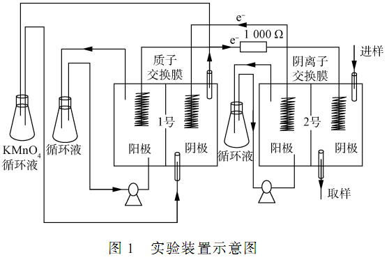 實驗裝置由 2 個雙室 MFC 反應器串聯組成分別為 1 號和 2 號(見圖 1) 。 1 號陰極液為 KMnO4 溶液( pH = 3) ,2 號陰極液為 CuSO4 溶液。 1 號反應器陰陽極由陰離子交換膜( AMI-7001,Membranes Interna-tional Inc. ,USA)分隔開,2 號反應器由陽離子交換膜分隔開( CMI-7000, Membranes International Inc. ,USA) 。