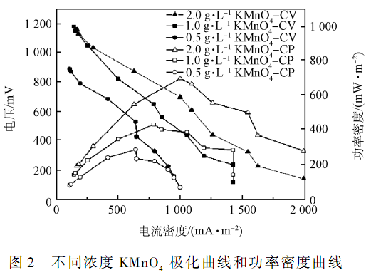 值得注意的是,經過 24 h 的反應,KMnO4 的濃度變化幅度較小,0. 5 mg·L - 1濃度僅下降 20% ,1. 0 mg·L - 1時 17% ,2. 0 mg·L - 1時 16% ,這說明 KMnO4 -MFC 能較好的作為 Cu-MFC 的電壓和功率的補充,使 Cu-MFC 陰極液中的 Cu2 +還原。