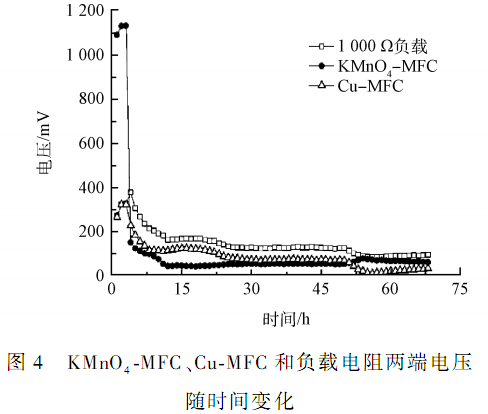 本實驗中,將 KMnO4 -MFC 與 Cu-MFC 串聯,前者可產生極高的電壓和功率,大大減少同濃度下 Cu2 +達到相同去除率所需要的時間,同時在兩者之間連接 1 000 Ω 的電阻,通過監測該電阻兩端的電壓計算兩者之間電流,得出前者除補給后者外所獲得的額外的電能。