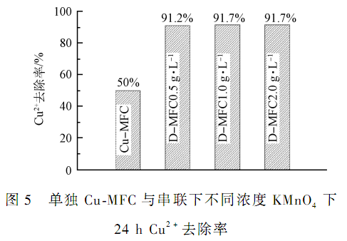 圖5 顯示了4 種連接方式下24 h 對 Cu2 +的處理效率,分別為單獨 Cu-MFC、串聯 KMnO4 -MFC 與 Cu-MFC(KMnO4 濃度分別為 0. 5、1. 0、2. 0 g·L - 1) 。 可以看出 4 種連接方式下 24 h 去除效率分別為 50% 、91. 2% 、91. 7% 、91. 7% ,不難看出串聯條件下的24 hCu2 +去除效率比單獨 Cu-MFC 去除效率最高提高41. 7% 。 在串聯條件下,按照上文中 KMnO4 -MFC 電流電壓曲線的趨勢可知隨著 KMnO4 濃度的增加KMnO4 -MFC 提供給 Cu-MFC 的電壓和功率隨之增大,但陰極電解液中的 Cu2 +的去除速率提高并不明顯,KMnO4 濃度由 0. 5 g·L - 1提高至 1. 0 g·L - 1時去除效率僅提高 0. 5% ,提高至 2. 0 g·L - 1時處理效率未見明顯提高。 說明一味地提高電壓補給,并不能一直提高負載 Cu-MFC 的處理效率,可能與 Cu-MFC本身性能也有聯系,可通過勒夏特列原理解釋,即 Cu2 +的回收速率在前端電壓補給充足的情況下下取決于 Cu2 +本身接受電子的能力。