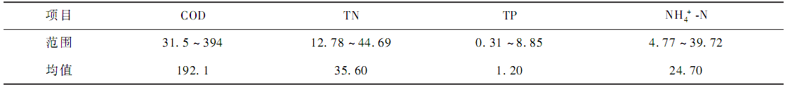 中試裝置搭建于昆明第四污水廠內,進水為經污水廠三道格柵處理后的生活污水和污泥脫水原液,實驗期間進水水質見表 1。 實驗進水水質波動較大,其中 C / N(質量比)為 5. 40,根據傳統脫氮理論,進水碳源稍顯不足,屬于低 C / N 值生活污水,脫氮難度較大。