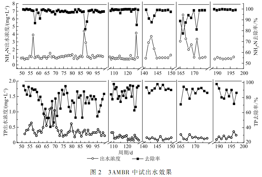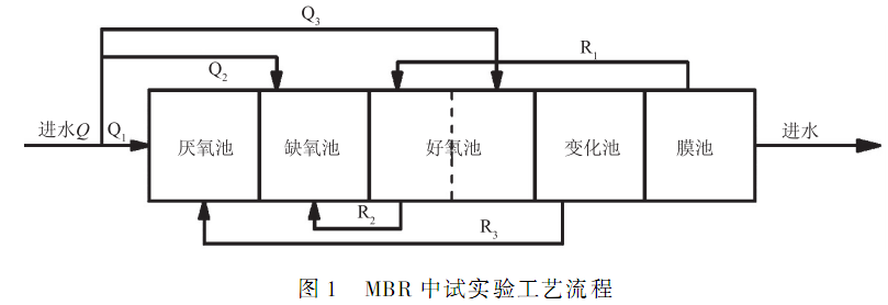 中試裝置的污泥齡為 15 d,膜池約為 7 g·L - 1,好氧池與變化池約為 6 g·L - 1,厭氧池與缺氧池約為5 g·L - 1。 總水力停留時間( hydraulic retention time,HRT)為 14. 04 h(其中:厭氧區 1. 08 h、缺氧區 7. 02h、好氧區 4. 32 h、膜區 1. 62 h) 。 該工藝設置了 3 個混合液回流:膜池至好氧池( R1 ) 、好氧池至缺氧池(R2 ) 、變化池至厭氧池(R3 ) 。 產水由自吸泵間歇抽吸出水,抽停時間比為 9 min / 1 min,每周進行一次維護性清洗( enhanced flux maintenance,EFM) 。 進水量、回流量與曝氣量主要通過電磁閥(2W- 250-25) 、液體電磁流量計(BTLD-20016 1110)與氣體流量計控制。