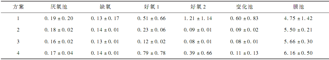 本研究優選了 4 套實驗方案,其中方案 1 模擬昆明市第四污水處理廠處理工藝流程。 其他方案與方案 1 相比,主要調整如下:方案 2,完全停止好氧池曝氣,加大 R1 回流,主要考察膜池富余溶解氧利用替代曝氣的效果;方案 3,降低好氧池首段曝氣量,主要考察降低曝氣量的影響;方案 4,改變進水方式,考察多點進水運行工況的效果。 各方案運行的具體變量對比如表 2 所示。