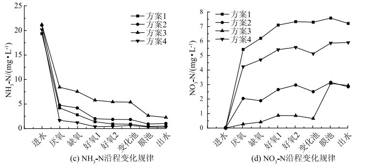 各方案在運行期間均達到了較好的 COD 去除效果,去除率分別為 86. 23% 、 87. 47% 、 84. 79% 、89. 65% 。 從沿程污染物濃度變化情況(圖 3)可知,由于受到生化降解及回流液稀釋的作用,各方案 COD濃度在厭氧池下降幅度較大,可達到 81. 28% 以上,后續處理單元對 COD 也有少量的去除作用。 改變運行參數后(方案 2、方案 3 及方案 4) ,各單元 COD 去除率均略有下降,但與對照組相比差異并不顯著,不影響出水達標(均低于 30 mg·L - 1) 。 這表明,不同供氧方式及進水方式對 COD 處理效果的影響不大。 當改變供氧方式時(方案 2 或方案 3)好氧池溶解氧均值低于 0. 25 mg·L - 1,與厭氧池、缺氧池 DO 梯度變小, MBR 工藝中有機物的去除主要通過生化降解,而該套工藝中由于膜系統的存在具有極好的泥水分離效果,污泥濃度高(5 ~ 8 g·L - 1) ,保證了 COD 的良好去除率。 當采用多點進水時(方案 4) ,對碳源進行了重新分配,但未見缺氧池與變化池 COD 值出現明顯上升,主要原因是污泥濃度較高,有機物在反應器前段快速被消耗,而本次實驗的采樣點則位于處理構筑物的末端。