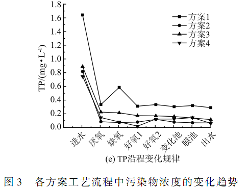 方案 4 采用分段進水的方式,雖然變化趨勢與方案 1 接近,并且也出現了較高的 NO3 -N 累積,但由于較為均勻地分配了氮負荷與碳源,硝化/反硝化過程得以更好地進行,其中好氧 2 段至變化池末端,NO3 -N呈現明顯下降趨勢,出現二次反硝化作用,但與方案 2 對比,結合溶氧值與 COD 變化趨勢可知,主要是因為多點進水為處理流程末端反應池提供了充足的碳源,所以沿程各項氮素指標均優于方案 1,并最終達到了更好的脫氮效果。 結果表明,多點進水可合理分配碳源,降低反應器前端負荷,從而提高脫氮效率。