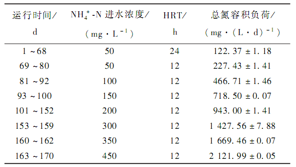 表 1 和表2 分別為反應(yīng)器 R1 和 R2 的運(yùn)行操作過(guò)程。 2 反應(yīng)器初始進(jìn)水 NH +4 -N 濃度均設(shè)在50 mg·L - 1,各階段穩(wěn)定后提高進(jìn)水基質(zhì)濃度,最終 NH +4 -N 的進(jìn)水濃度為 450 mg·L - 1,2 反應(yīng)器進(jìn)水 NH +4 -N 和NO -2 -N 的比例一直控制在 1 ∶ 1. 32,除去初始的污泥馴化適應(yīng)階段,水力停留時(shí)間 HRT 均保持在 12 h。
