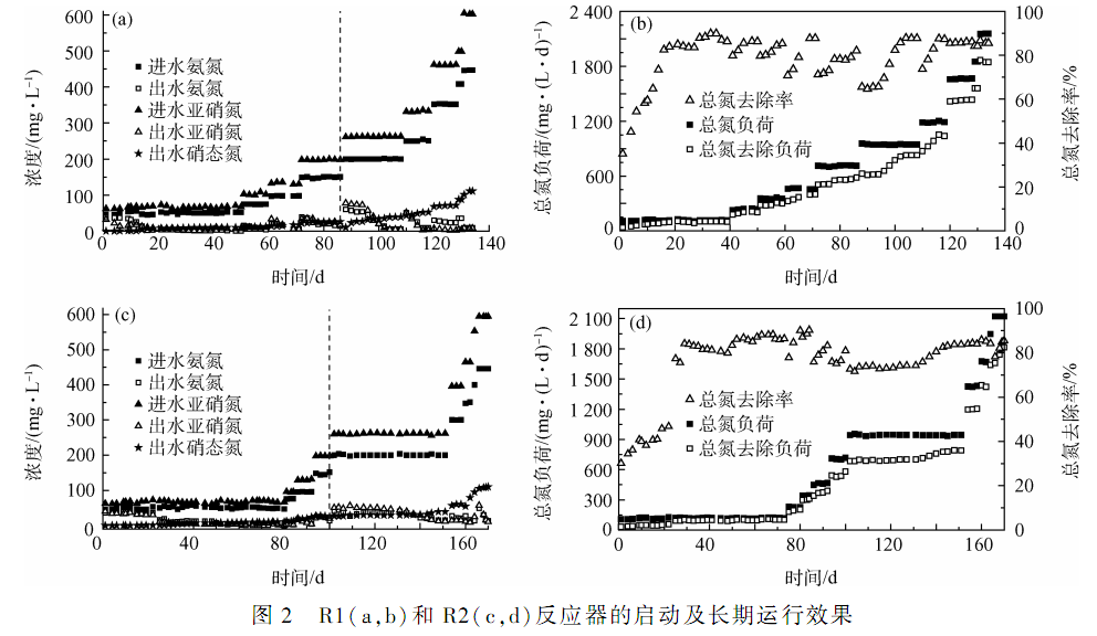 啟動(dòng)成功后,進(jìn)一步提高進(jìn)水基質(zhì)負(fù)荷,考察系統(tǒng)脫氮性能。 R1 在 87 ~ 134 d 期間,進(jìn)水 NH +4 -N 濃度逐步提至 450 mg·L - 1,進(jìn)水容積氮負(fù)荷由 943. 79mg·( L·d) - 1提升至 2 155. 67 mg·( L·d) - 1,第134 天時(shí),反應(yīng)器內(nèi) NH +4 -N、NO -2 -N、NO -3 -N 的出水濃度分別為 8. 40、8. 11、110. 96 mg·L - 1,NH +4 -N 和 NO -2 -N 的去除率分別為 98. 12% 和 98. 66% ,總氮去除負(fù)荷為1 855. 43 mg·( L·d) - 1。 第135 天后,繼續(xù)提高基質(zhì)濃度,隨著容積氮負(fù)荷的升高,反應(yīng)器內(nèi)容積基質(zhì)氮的去除速率逐漸下降,故認(rèn)為第 134 天時(shí)反應(yīng)器厭氧氨氧化系統(tǒng)已接近最大去除能力。 同理,R2 運(yùn)行至170 d 時(shí),反應(yīng)器也基本達(dá)到最大去除能力狀態(tài),此時(shí),NH +4 -N、NO -2 -N、NO -3 -N 的出水濃度分別為 14. 24、10. 00、110. 05 mg·L - 1,NH +4 -N 和 NO -2 -N 的去除率分別為 96. 81% 和 97. 88% ,總氮去除負(fù)荷為 1 815. 12 mg·( L·d) - 1。