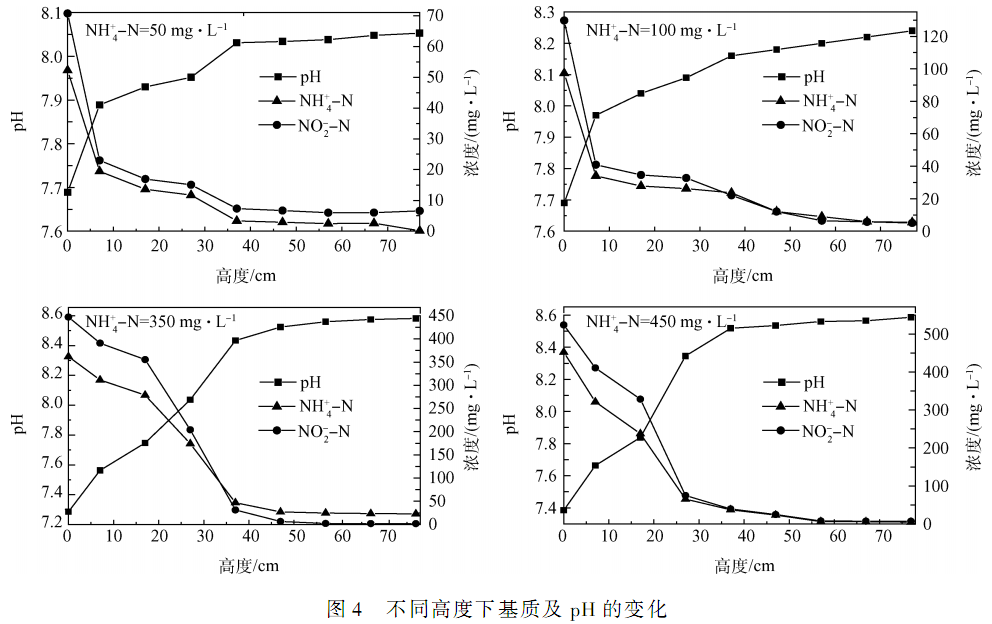 選取 R1 反應(yīng)器為研究對(duì)象,重點(diǎn)研究低進(jìn)水 NH +4 -N 濃度(50、100 mg·L - 1)和高進(jìn)水 NH +4 -N 濃度(350、450 mg·L - 1)下沿程基質(zhì)濃度和 pH 的變化。 取樣口共計(jì) 8 個(gè),距進(jìn)水口 0 cm 處的高度分別為 7、17、27、37、47、57、67 和 77 cm,結(jié)果見(jiàn)圖 4。 當(dāng)進(jìn)水 NH +4 -N 濃度較低時(shí)(≤100 mg·L - 1) ,約 70% 的基質(zhì)氮在反應(yīng)器內(nèi) 0 ~ 7 cm 處得到去除,這與 ZHANG 等報(bào)道的一致。 隨著進(jìn)水 NH +4 -N 濃度提升至350 mg·L - 1,甚至 450 mg·L - 1,氮的去除主要集中在 17 ~ 37 cm 處,這種變化可能是因?yàn)檫M(jìn)水高濃度基質(zhì)使得反應(yīng)器底部厭氧氨氧化菌受到抑制,從而使得較高處反應(yīng)更加明顯,雖然基質(zhì)濃度隨高度逐漸降低,但對(duì)比低濃度(≤100 mg·L - 1) ,高進(jìn)水基質(zhì)濃度下反應(yīng)器同一位置還是殘留著較高濃度的基質(zhì),抑制作用仍不可忽視,故每10 cm 高的基質(zhì)濃度下降未出現(xiàn)明顯的驟降。 另外,進(jìn)水 NH +4 -N 濃度從50 mg·L - 1提升至 450 mg·L - 1時(shí),該期間反應(yīng)器 37 cm 以上區(qū)域厭氧氨氧化反應(yīng)都比較弱,約 80% ~ 90% 的進(jìn)水基質(zhì)氮的去除發(fā)生在反應(yīng)器 0 ~ 37 cm 處,這說(shuō)明,利用傳統(tǒng) UASB 運(yùn)行厭氧氨氧化反應(yīng),其容積利用效率較差。