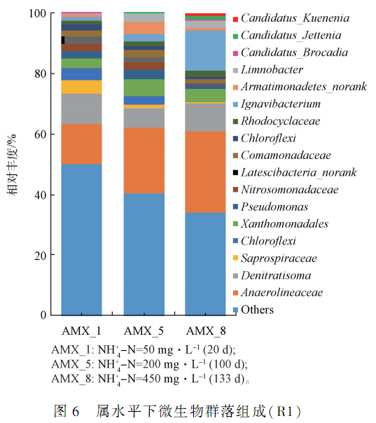 3)R1 在 134 d 長(zhǎng)期運(yùn)行中微生物的種群結(jié)構(gòu)組分也發(fā)生了變化,優(yōu)勢(shì)菌種由啟動(dòng)時(shí)的 Candidatusbrocadia 變?yōu)?Candidatus Jettenia 和 Candidatus Kuene-nia 的混合菌種。