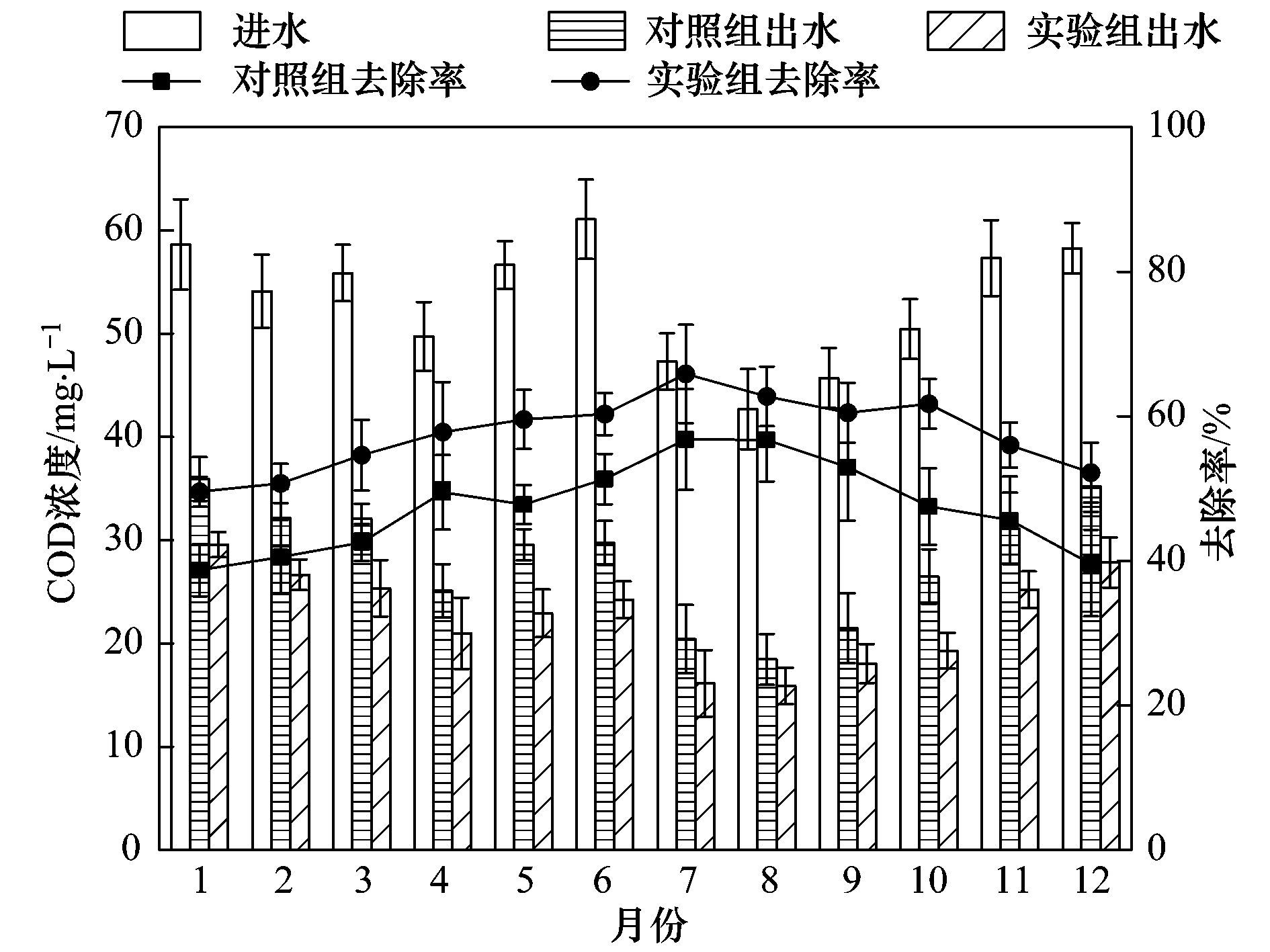 兩組人工濕地對尾水中COD的去除效果如圖 2所示.從中可知, 實驗組全年對COD的去除效果優于對照組.采用SPSS軟件進行統計學分析, 兩組濕地COD去除率存在顯著性差異(P<0.05).濕地對COD的去除, 呈現出季節性變化, 隨氣溫的升高而提高.實驗組全年出水COD穩定在30 mg·L-1以下, 滿足地表水Ⅳ類標準(30 mg·L-1), 而對照組在寒季(江蘇地區12月到次年2月, 平均氣溫14.7℃)出水COD超過30 mg·L-1.對照組和實驗組COD全年平均去除率分別為47.48%、57.64%, 暖季(江蘇地區3~11月, 平均氣溫26.3℃)平均去除率分別為50.10%、59.91%, 寒季平均去除率分別為39.61%、50.83%, 實驗組全年、暖季、寒季COD平均去除率分別高出對照組10.16%、9.81%、11.22%.可見, 基質摻雜鐵炭能夠提高濕地對COD的去除效果, 且冬季的提升效果更為明顯.這可能主要是因為在污水浸漬條件下, 摻雜在濕地基質中的鐵炭形成原電池, 陽極發生電極反應Fe-2eFe2+(E0=-0.44 V), 陰極發生電極反應O2+2H2O+4e4OH-(E0=+0.40 V).鐵炭內電解過程產生大量活性的[H]和Fe2+, 使尾水中的復雜有機物發生開環、斷鏈等作用, 另外, 在活性Fe2+被O2氧化成Fe3+的過程中, 會產生具有強氧化性的·OH、O·, 破壞—CN和C=O鍵.原電池反應過程中產生的活性基團促進了難降解有機物分解為小分子, 強化了微生物對尾水中有機物的利用, 促進了濕地對COD的去除.