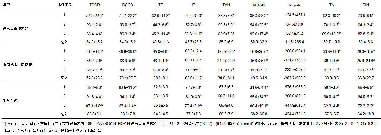 不同運行工況(水力負荷/分流比)的調整對生物濾池的凈化效能存在顯著影響, 且兩種不同類型生物濾池的凈化效能也存在顯著差異(P<0.05).就曝氣垂直流濾池而言, 不同水力負荷對亞硝氮的去除率無顯著影響, 對其它指標有顯著影響; 類似地, 在折流式水平流濾池中不同分流比對無機磷和亞硝氮的去除率無顯著影響, 對其它指標相反; 針對組合系統, 不同運行工況對總磷、氨氮及亞硝氮的去除率無顯著影響, 對其它指標相反.除溶解性有機物和硝氮外, 兩種不同類型濾池對其它指標的凈化效率都存在顯著差異(表 3).