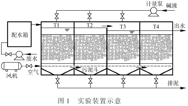 實(shí)驗(yàn)裝置如圖1 所示,其主體為4 級(jí)生物膜反應(yīng)器,由T1、T2、T3、T4 等4 個(gè)好氧反應(yīng)單元串聯(lián)而成,有效容積分別為1. 71、1. 71、1. 64 和1. 61 m3 ,廢水在反應(yīng)器中呈折流狀態(tài)逐級(jí)流動(dòng)。各單元均設(shè)有填充率為70% 的親水性網(wǎng)狀交聯(lián)大孔載體、微孔曝氣裝置及穿孔排泥管,載體為自制3 cm × 3 cm × 3cm 立方體,孔隙率96. 7% 、持水倍率31. 2、比表面積3. 8 × 105 m2 ·m - 3 、孔徑范圍為2. 5 ~ 5 mm,處理過(guò)程中呈懸浮狀態(tài)。載體上脫落的生物膜可沉積至污泥斗,通過(guò)穿孔排泥管定期排出反應(yīng)器。反應(yīng)器外部設(shè)有風(fēng)機(jī)、進(jìn)水調(diào)節(jié)系統(tǒng)及堿液補(bǔ)充系統(tǒng)。處理過(guò)程中通過(guò)回轉(zhuǎn)式風(fēng)機(jī)持續(xù)供氣,供氣量根據(jù)在線DO 儀讀數(shù)和PLC 控制系統(tǒng)調(diào)整風(fēng)機(jī)頻率,與在線pH 計(jì)聯(lián)鎖的堿液補(bǔ)充系統(tǒng)可根據(jù)pH 變化向需要補(bǔ)充堿度的單元及時(shí)投加氫氧化鈉溶液,進(jìn)水調(diào)節(jié)系統(tǒng)中可根據(jù)實(shí)驗(yàn)需要調(diào)整進(jìn)水污染物負(fù)荷。