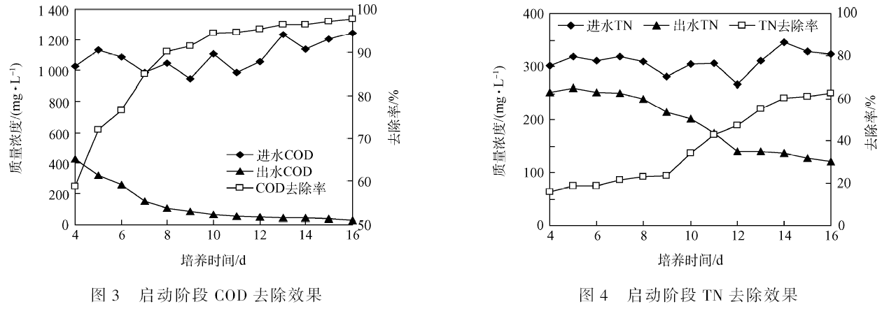 啟動(dòng)階段第4 ~ 16 天,反應(yīng)器以0. 12 m3 ·h - 1的流量連續(xù)進(jìn)水,NH +4 -N、COD 及TN 去除效果的變化如圖2 ~ 圖4 所示。悶曝養(yǎng)生(啟動(dòng)階段前3 d)結(jié)束后,NH +4 -N 及COD 的去除效果即呈現(xiàn)顯著提高的趨勢(shì),而TN 去除效果則在第9 天之后呈現(xiàn)顯著提高的趨勢(shì)。啟動(dòng)階段第8 天,肉眼可見(jiàn)載體表面附著黃褐色生物膜,第13 天通過(guò)顯微鏡觀察可發(fā)現(xiàn)生物膜系統(tǒng)已形成完整的生物群落,第16 天通過(guò)掃描電鏡觀察可以發(fā)現(xiàn)載體表面及內(nèi)部孔道負(fù)載大量桿菌和球菌,微生物固定化過(guò)程基本完成。經(jīng)過(guò)16 d 的培養(yǎng),反應(yīng)器較快地完成了微生物的馴化及固定化,對(duì)NH +4 -N、COD 及TN 的去除率分別達(dá)到99. 8% 、97. 8% 和62. 7% 。