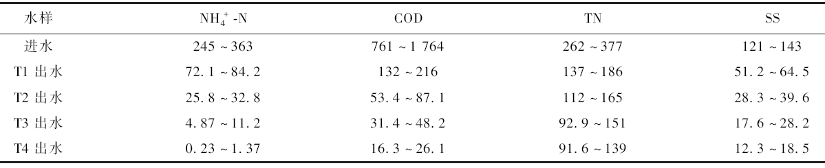 實(shí)驗(yàn)由啟動(dòng)、穩(wěn)定運(yùn)行及關(guān)鍵參數(shù)分析3 個(gè)階段組成。啟動(dòng)階段的前3 d 進(jìn)行悶曝,將廢水引入反應(yīng)器使各單元水位達(dá)到設(shè)計(jì)要求,開(kāi)啟回轉(zhuǎn)式風(fēng)機(jī)進(jìn)行曝氣,每天向各單元投加由枯草芽胞桿菌、產(chǎn)堿桿菌、亞硝化單胞菌、銅綠假單胞菌組成的復(fù)合微生物菌劑1 次,投加量依次為60、40 和20 g。養(yǎng)生3 d 后開(kāi)始以0. 12 m3 ·h - 1 的流量連續(xù)進(jìn)水、連續(xù)曝氣并維持各單元ρ(DO) = 3 ~ 5 mg·L - 1 ,期間向需要補(bǔ)堿的單元投加氫氧化鈉溶液并保證反應(yīng)器出水pH > 7,每天定時(shí)檢測(cè)反應(yīng)器進(jìn)、出水NH +4 -N 及COD 變化。穩(wěn)定運(yùn)行階段考察系統(tǒng)處理效果的穩(wěn)定性及反應(yīng)器沿程水質(zhì)變化特征,共運(yùn)行21 d,期間HRT = 55. 6 h,ρ(DO) = 2. 1 ~ 3. 2 mg·L - 1 、水溫18. 7 ~ 24. 1 ℃ ,在T3 單元投加氫氧化鈉溶液。關(guān)鍵參數(shù)分析階段主要考察HRT、進(jìn)水NH +4 -N 負(fù)荷及進(jìn)水COD 負(fù)荷變化對(duì)處理效果的影響,通過(guò)調(diào)整進(jìn)水流量改變HRT,投加氯化銨溶液改變進(jìn)水NH +4 -N 濃度,投加甲醇改變進(jìn)水COD 濃度,操作過(guò)程中控制各單元ρ(DO) = 2. 5 ~3. 5 mg·L - 1 、水溫18. 7 ~ 24. 1 ℃ ,控制反應(yīng)器出水pH > 7。