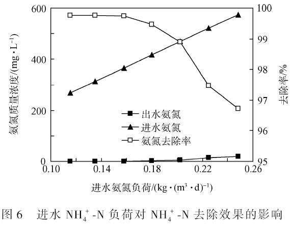 受煤氣化生產(chǎn)線不穩(wěn)定因素的影響,生物處理單元進(jìn)水水質(zhì)波動(dòng)較大,這就要求反應(yīng)器對(duì)進(jìn)水負(fù)荷變化具備一定的緩沖能力,因而需要考察進(jìn)水負(fù)荷對(duì)反應(yīng)器處理效果的影響。在HRT = 55. 6 h,進(jìn)水ρ(COD) = 983 ~ 1 347 mg·L - 1 的條件下,進(jìn)水NH +4 -N 負(fù)荷對(duì)NH +4 -N 去除效果的影響如圖6 所示。