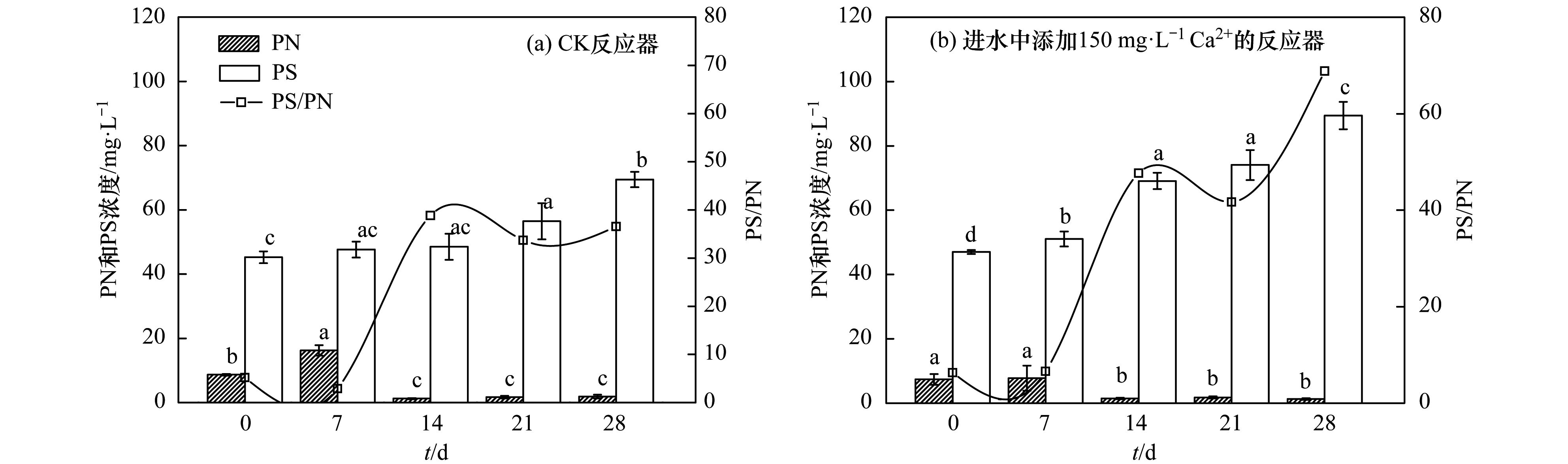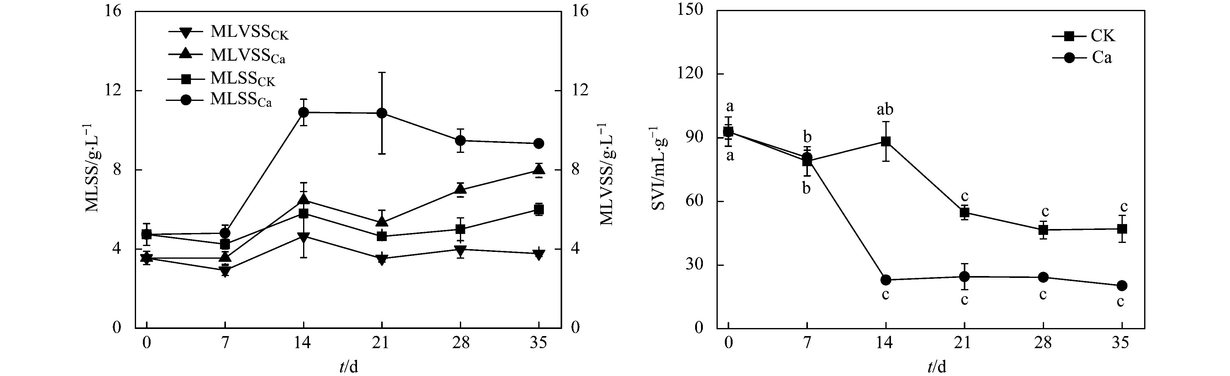 前期實驗, 在進水中外源添加不同質量濃度Ca2+(0、30、50、100、150、200 mg·L-1), 當Ca2+添加量為100~200 mg·L-1時, 明顯改善了活性污泥沉降性能和污染物去除性能, 因此本研究中外源Ca2+添加量設置為150 mg·L-1(在圖中以Ca表示), 同時以進水中不添加Ca2+(0 mg·L-1)的SBR作為對照(以CK表示), 研究外源添加Ca2+對活性污泥啟動期污泥性能及EPS產生的動態影響.