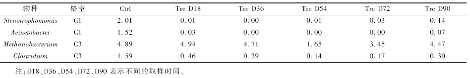 格室1 內的寡養單胞菌屬(Stenotrophomonas)和不動桿菌屬(Acinetobacter)、格室3 內的梭菌屬(Clostridium)和甲烷桿菌屬(Methanobacterium)隨著四環素的添加,豐度先減小后增加,如表2 所示,在四環素添加初期,這些微生物物種在相應格室內受到的抑制作用較大,隨著時間的推移,所受抑制作用減弱,耐藥性增加,說明四環素的長期污染能使微生物的耐藥性發生改變。