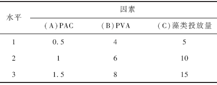 本研究選取海藻酸鈉濃度為2% ,以聚乙烯醇、活性炭和包埋藻量為正交實驗因素,選用L9 (33 )正交表進行正交實驗。以處理后廢水中鋅離子的殘留量考察顆粒吸附鋅離子的性能。運行條件:溫度25 ℃ 、pH 為7、轉速200 r·min - 1 振蕩吸附2 h。取上清液過濾,然后測定鋅離子濃度。每個處理重復3 次。實驗各因素和水平設計見表1。